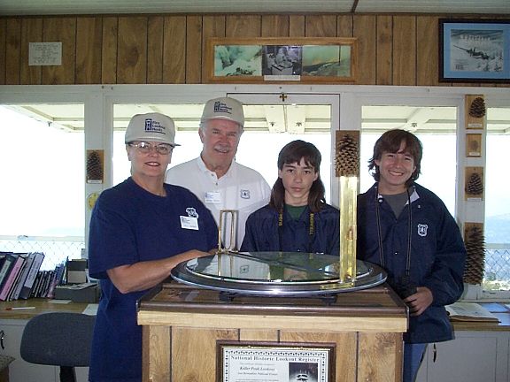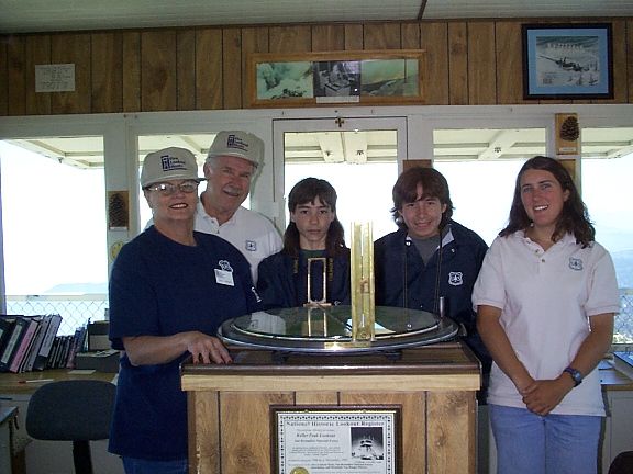 Our hosts at the Lookout Tower and the Osborne Fire Finder, an instrument to measure azimuths and elevation angles. (4/5 of our hosts). From left to right, our hosts are Terry and Marvin Ballard, Bryan and Nicolas Oku, and Melissa Sladek. These people are all part of the wonderful Children's Forest located just north of Keller peak.